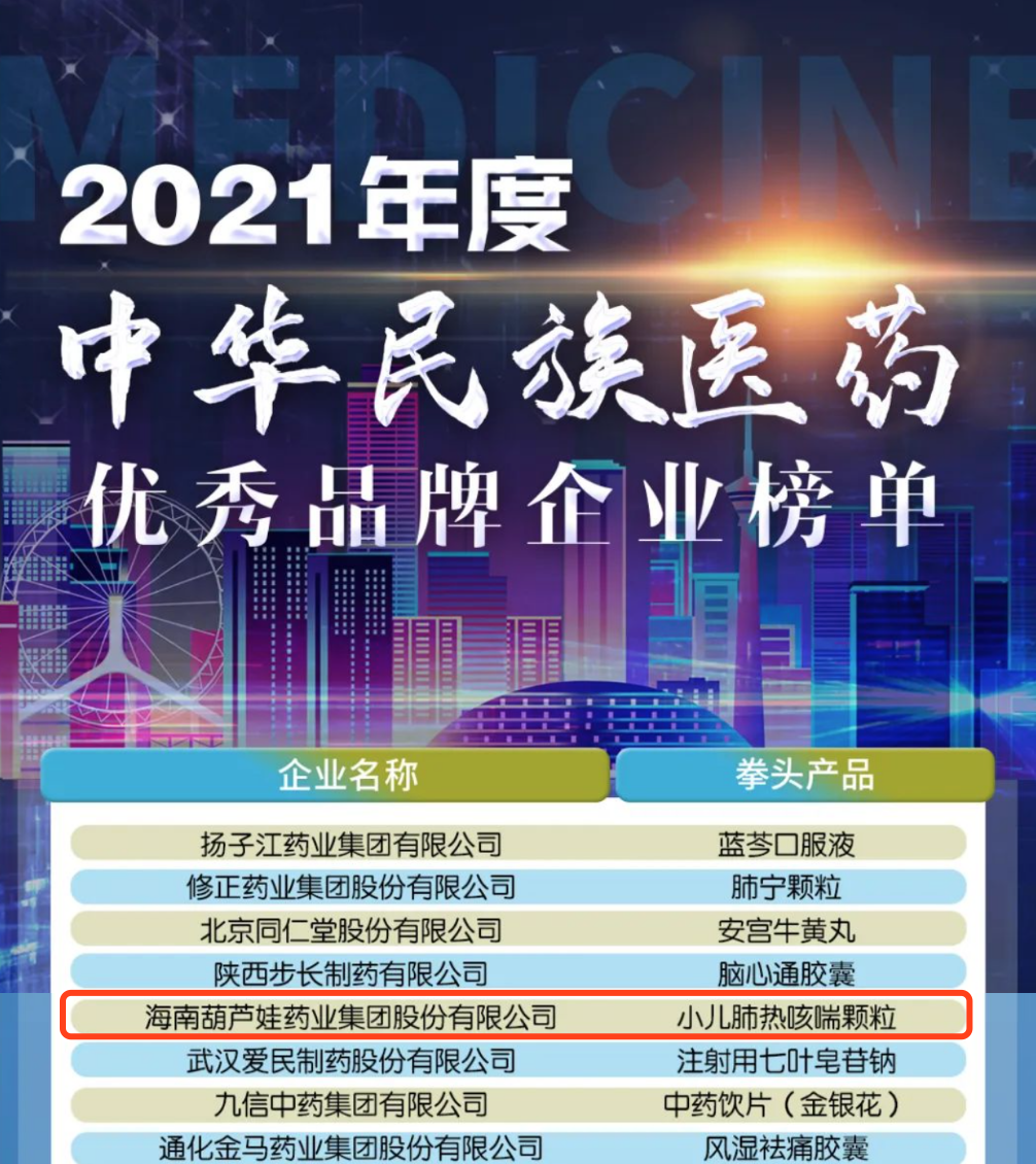 12月29日,全国工商联医药业商会发布了“2021年度中华民族医药优秀品牌企业榜单”,鼎博药业集团凭借黄金单品小儿肺热咳喘颗粒(4克)实力登榜。